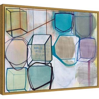 ART DESCRIPTION: A seemingly random collection of loosely interpreted geometric shapes makes u the body of this work. The structure is composed of solid lines in shades of black, teal and brown filled with pastel shades of teal, purple and yellow. This Amanti Art canvas art print was created by Taitz Duffy and printed by Amanti Art in Madison WI. The canvas is stretched by hand and finished with a float frame. Individually made using traditional custom framing techniques, it has the quality you would expect from your local frame shop. Because of our attention to detail and focus on artistry, architects, interior designers, and homeowners alike choose this framed canvas artwork to create beautiful living spaces.