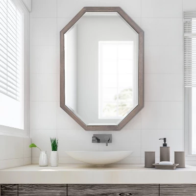 The Hogan mirror is the perfect addition to your farmhouse-inspired home. This mirror puts a modern twist on the farmhouse aesthetic, featuring an octagonal shape that draws the eye and adds a chic dimension to your wall. The frame of the Hogan is made from solid wood and features a rustic graywash finish reminiscent of vintage decor pieces. This frame gives the Hogan a resilient quality that lasts for multiple years of display. Its overall dimensions are 24 inches wide by 1 inch deep by 36 inches tall, making it a commanding presence for any room. If you’re renovating your bathroom, the Hogan is fantastic as a bathroom mirror above a single or double vanity. Adding this reflective accent as a decorative focal point increases the vibrancy of your space while making it appear brighter and dimensional. Hang it in your entryway, bedroom, dining room, or living room to create a fun and unique statement. This mirror is easy to mount on your wall regardless of where you hang it with the metal D-ring hangers, allowing it to hang in multiple orientations.