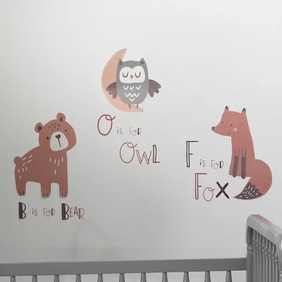These adorable wall decals/stickers feature our loveable bear, mischievous fox, and wise owl. There are three sheets that are approximately 12” X 18” and a total of 15 pre-cut pieces. Our huggable bear is 13 ½”, the sly fox is 14” and the owl on the crescent moon is 10”. Included is fun verbiage which says B is for Bear, O is for Owl and F is for Fox. These decals work best on smooth walls. They are easy to apply and will not harm your walls when you remove them.