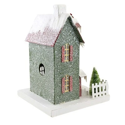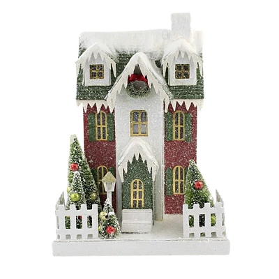 This Holiday Decorated House With A Snow Covered Colorful Roof Has Gold Trimmed Windows And Doors. A Green Sisal Wreath Hangs From The Peak Of This Traditional Styled House. Flat Iridescent Glitter Added For Sparkle & Shine.. New.. Measurements 10.50 In H X 7.75 In W X 7.75 In D. . No Assembly Required. Indoor Use Only. Imported