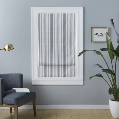 The Exclusive Home Curtains Ricardo Total Blackout Roman Shade in black features a multi-color jacquard stripe pattern on a blackout roman shade and offers a clean, modern accent for your window decor. A foam blackout backing blocks sunlight, provides privacy, and allows you to create darkness in your space any time of day, and a handle makes it easy to pull up and down. Hang this versatile shade in your living room, dining room, kitchen, office, bedroom, or entryway.