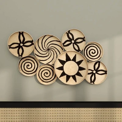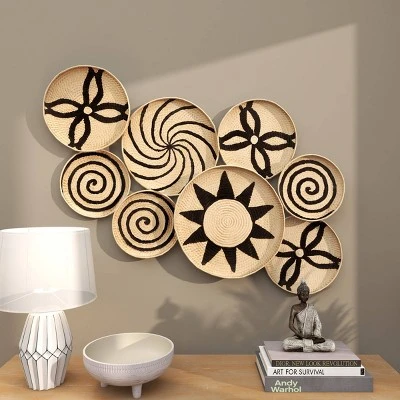 - This home wall decor features a collection of eight plates with various patterns for an eclectic look