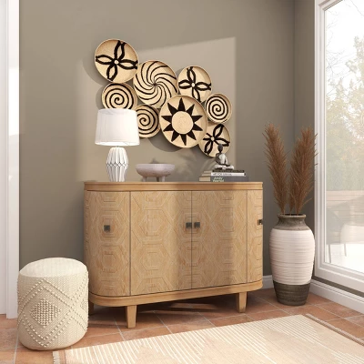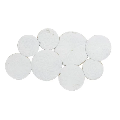 - This iron wall decor has round plates with swirls and other abstract patterns