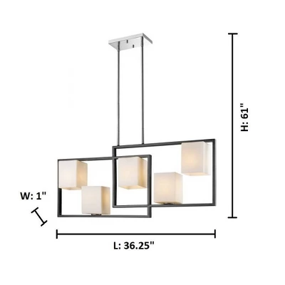 The Regis Falls Five Light Pendant presents a clean and straightforward piece with layered boxes that create an intriguing sense of depth. The bold two-tone black and brushed nickel finish aesthetic is a subtle nod to Modern style, while still having a minimal composition overall. Five Opal Glass Shades create a lit atmosphere with a sense of timeless style.