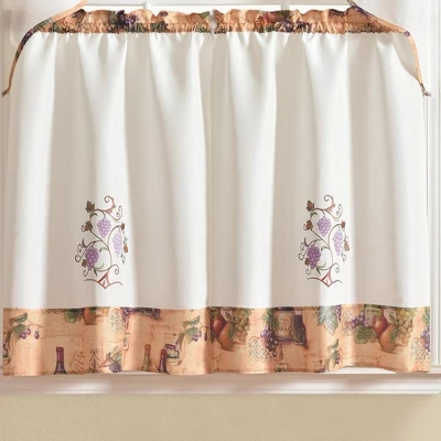 Add a touch of beauty and elegance to your windows with our lovely printed valance and tiers set. This 3-Piece set features beautifully printed, multi-colored designs to add charm to any room decor. The grape print and embroidered design will change and improve the look and feel of any room while adding a touch of style. Each printed fabric piece will instantly add depth and texture to your room. Set includes (1x) 60″ x 36″ Valance and (2x) 30″ x 36″ Tiers. Beautifully printed fabric trimming and printed window curtains add a splash of pop to any room. Available in an array of charming printed designs. Easy Care: machine washable – see care label. 100% Polyester. Color: Beige